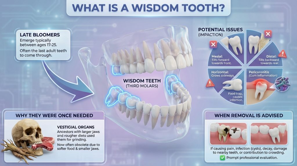 A wisdom tooth is one of the third molars located at the very back of the upper and lower jaws. These teeth usually emerge between the late teens and early twenties and may erupt fully, partially, or remain unerupted (impacted). A partially erupted or impacted wisdom tooth can create a pocket where bacteria collect, increasing the risk of infection, inflammation, and bad breath.