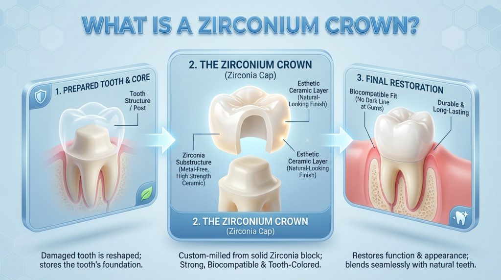 Placement usually involves preparing the tooth, taking an impression or digital scan, and fitting a custom-made crown that is cemented or screwed into place. Zirconium crowns are valued for their durability and aesthetic qualities, can be used on front or back teeth, and generally require the same oral hygiene and care as natural teeth to ensure long-term success.