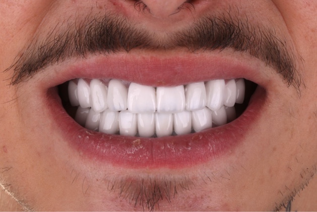 Om de verkleuring en scheefstand van zijn tanden aan te pakken, werden er 24 porseleinen kronen geplaatst. De ongewenste verkleuring werd opgelost en de porseleinen kronen zorgden voor een helderder, wit uiterlijk. De kronen werden ook gemaakt om zijn tanden precies uit te lijnen, waardoor hij de rechte glimlach kreeg die hij altijd al wilde. Deze behandeling garandeerde een langdurig en natuurlijk uitziend resultaat voor zijn geval.