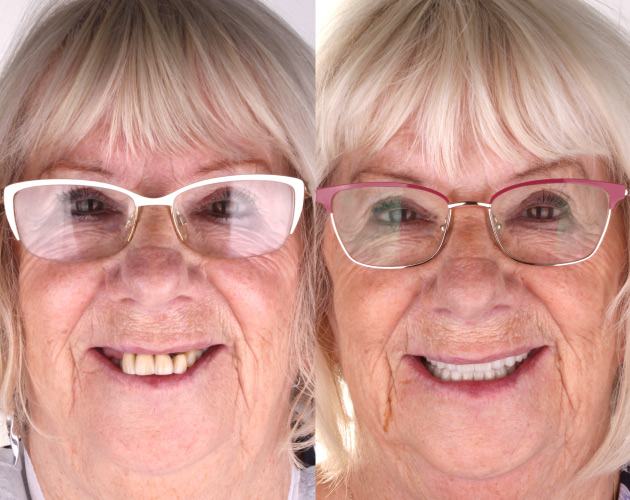 In de onderkaak werden geïnfecteerde tanden behandeld met een wortelkanaalbehandeling en er werden porseleinen kronen op geplaatst. Dit resulteerde in een verbetering van zowel het uiterlijk als de uitstraling van haar tanden.